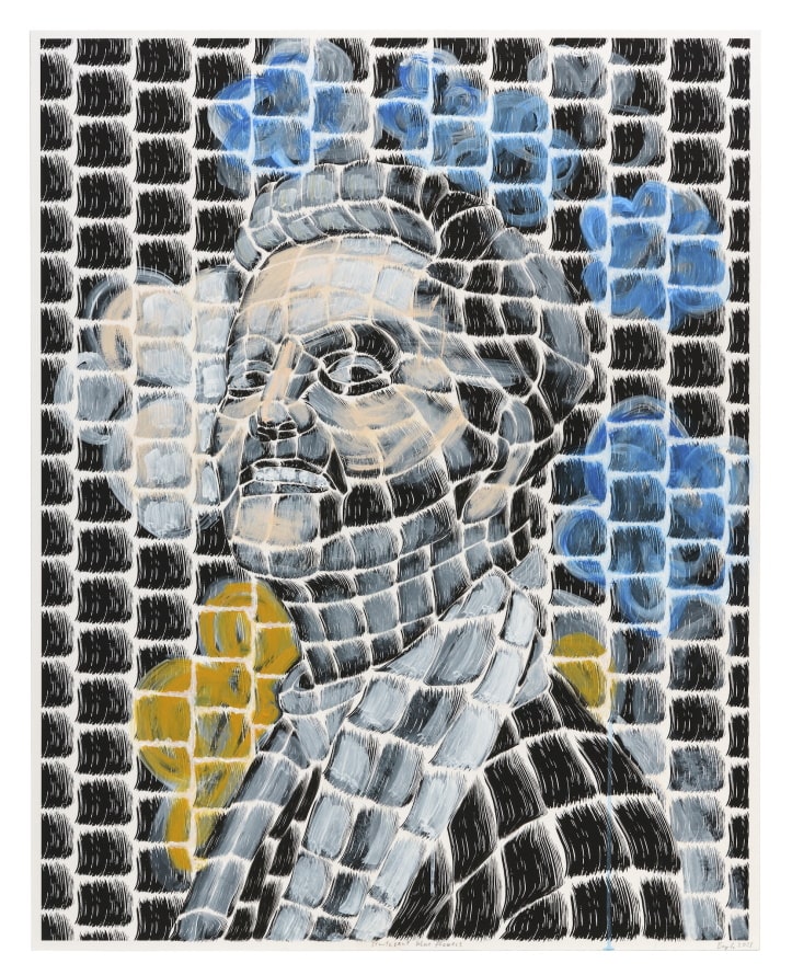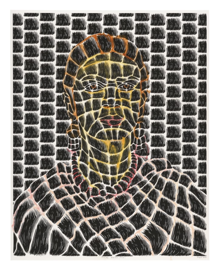 Image caption titlel: Thomas Bayrle, Frida Kahlo (Gold), 2021, mixed media on pigment print on paper on cardboard, 111 x 88 cm, © Thomas Bayrle, VG Bild-Kunst, Bonn, courtesy the artist and neugerriemschneider, Berlin, Photo: Wolfgang Günzel