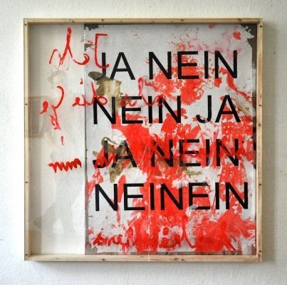 Die Bilder der Ausstellung kombinieren Schriftzeichen mit Abdrücken von Körpern. Körper und Text: zwei Medien, die in vieler Hinsicht miteinander verwoben sind, ohne dass dies je ihre grundsätzliche Verschiedenheit aufheben könnte. Vereinte Gegensätze in Bildern (bedrucktes Papier auf Jute, Farbe, Holz, Plexiglas), die das Paradigma von Flächigkeit und Autonomie aufgeben, zugunsten von Transparenz, Spiegelung und veränderlicher Perspektive in übereinander gestaffelten Ebenen.