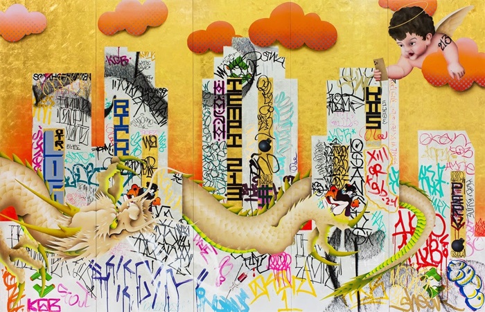 Gajin Fujita (geboren 1972 in Los Angeles, USA) spielt mit den Codes der amerikanischen Populärkultur und verwebt sie mit Bildelementen aus der Vielfalt der Ethnien und Kulturen in einer globalisierten Welt. Durch die Verschmelzung von Logos multinationaler Unternehmen mit Motiven, die an die Holzschnitte und Ukiyo-e-Gemälde der Edo-Zeit erinnern, und mit Stammes-Graffiti, die den Hintergrund für Raffaels Putten bilden, eröffnet sich ein wahrhaft zeitgenössischer Kosmos der Verflechtung. Fujitas Arbeiten sind Ausdruck und Ergebnis einer zeitgenössischen, vielschichtigen Kultur- und Bildproduktion; seine Bildräume offenbaren in ihrem „all-over“ die Gleichzeitigkeit der äußerst widersprüchlichen kulturellen Zeichen der Wirklichkeit. So ist das durchweg populäre Werk des kalifornischen Malers auf der Höhe der Zeit, ohne die Geschichte aus den Augen zu verlieren. Christopher Knight von der Los Angeles Times lobte Fujitas Gemälde als „die wichtigste Darstellung des Einflusses von Graffiti auf die Kunst im 21. Jahrhundert“.