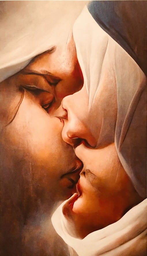 Bildunterschrift Titel: Hans-Peter Adamski, o.T., 2024, KI-generiertes Werk (Midjourney) zum vorgegebenen Thema „Gott küsst Allah“.