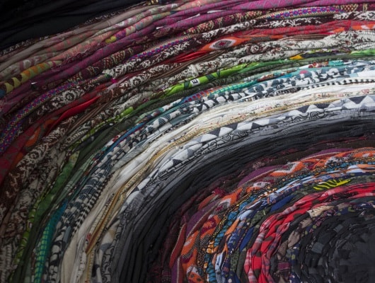 Mittelpunkt und titelgebende Arbeit ihrer aktuellen Ausstellung On weaving a basket ist eine großformatige, textile Skulptur – ein überdimensionaler Korb, den Gallardo in zeitraubender Handarbeit geflochten hat: die unterschiedlichen Flechtstränge bestehen aus traditonellen Stoffarten verschiedener Ethnien und Kulturkreise mit ihren typischen Farben und Mustern, die Gallardo von den lokalen Märkten der unterschiedlichen Communities in Berlin zusammengetragen hat. Das Flechtwerk symbolisiert dabei gleichsam die ethnisch-kulturellen Schichtungen der Berliner Gesellschaft: Gallardo hat offizielle Migrationsstatistiken des Landes Berlin herangezogen und deren Zahlenwerte exakt prozentual in die dem jeweiligen Land bzw. der jeweiligen Kultur entsprechende Stoffart umgesetzt: ausgehend vom Konzept des Kosmopolitischen bietet Gallardo so eine globale Vision der Stadt Berlin und findet gleichzeitig eine Metapher für den Körper im Raum – die Spirale des stetig wachsenden Korbgeflechts repräsentiert für Gallardo die Demarkationslinien der Stadt und das komplizierte Geflecht von Beziehungen, die sie konstituieren und aufbauen.