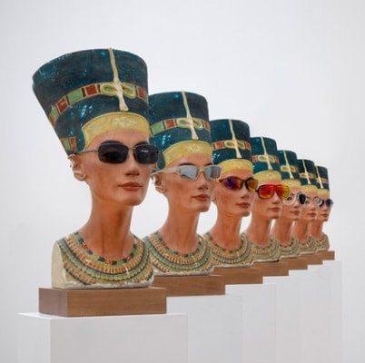 Bildunterschrift: Nofretete, 2014, 7 Gipsbüsten mit Brillen, Holz, auf Holzsockeln mit Rollen je 190,7 x 40 x 50 cm, 4 Metallplatten, je 150 x 120 cm, Installationsgröße variabel, Courtesy Galerie Buchholz, Köln/Berlin/New York, David Zwirner, New York/London und Hauser & Wirth © Isa Genzken, VG Bild – Kunst, Bonn 2016