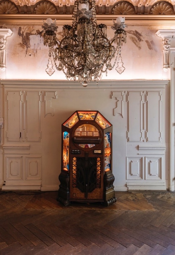 Bildunterschrift Titel: „Juke-Joint“, 2023, Jukebox, vinyls (Leila Negra discography), Installation view, Portikus, Frankfurt am Main, Courtesy of the artist, Portikus, Photo: Eike Walkenhorst