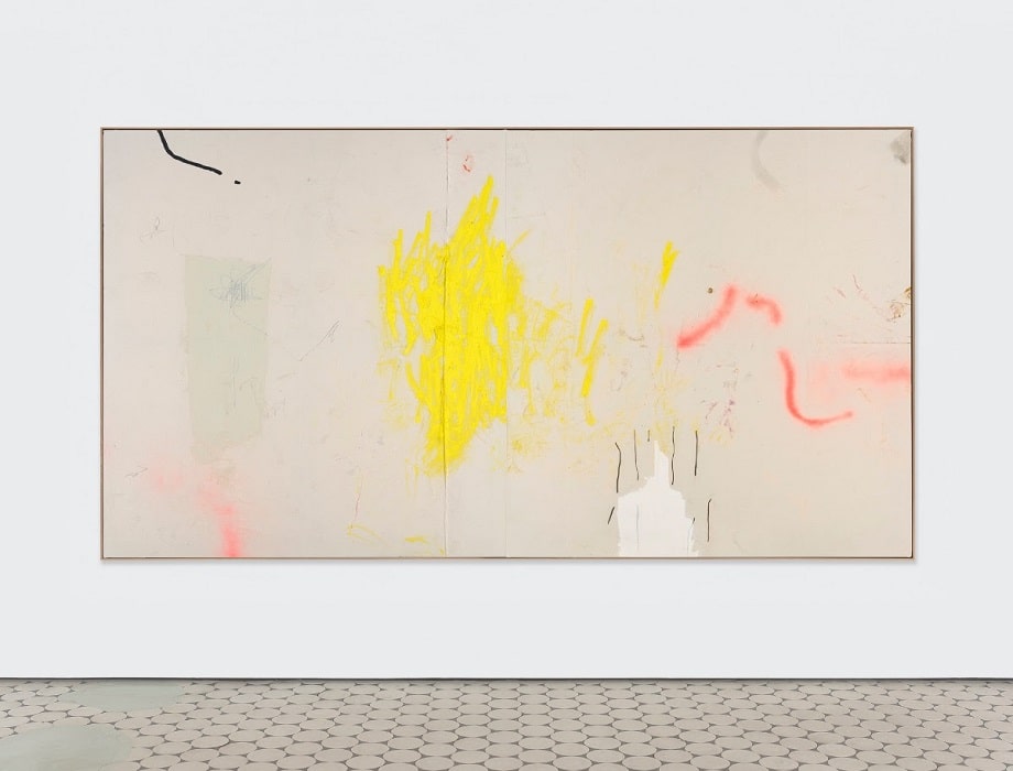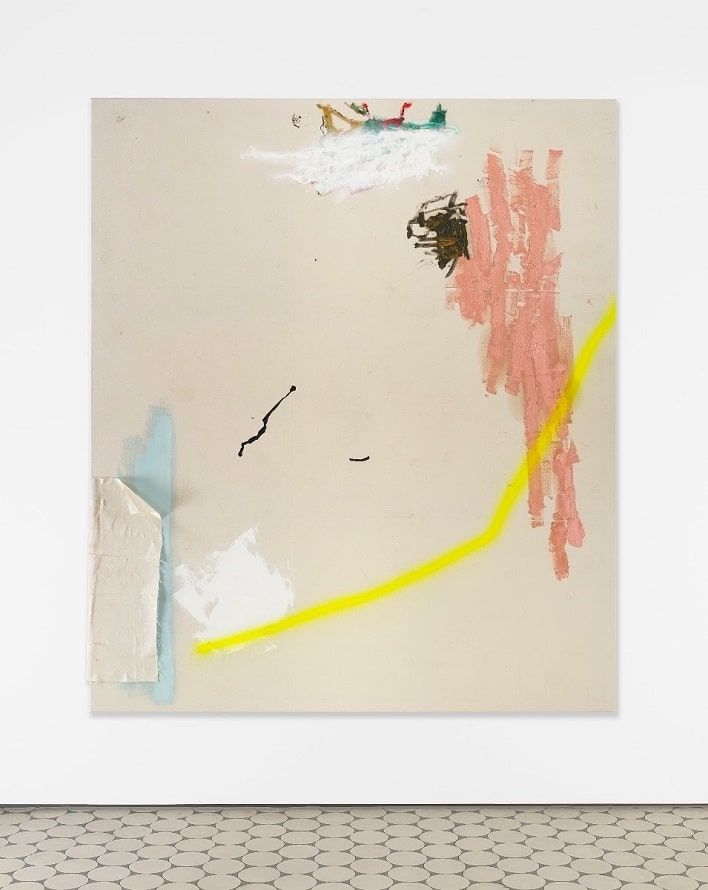 Jenny Brosinskis Bilder verhandeln Beziehungen zur Leere. Sie wissen, dass die Leere wie die Stille ohrenbetäubend sein kann, sich aber auch zu etwas Ausgedehntem öffnen kann, das der Freiheit nahe kommt. Brosinski arbeitet groß, in letzter Zeit auf Leinwänden, die zwei oder drei Meter breit sind, um die Präsenz der rohen Leinwand, auf der sie ihre Gesten choreographiert, zu erweitern. Trotz der kühnen Grobheit ihrer Markierungen wirken diese Flecken aus verwischtem rosa Öl oder nachlaufende Linien aus gelber Sprühfarbe nicht wie Übergriffe auf die Leinwand, sondern eher wie eine Art der Navigation und der Betonung ihrer Umfassungsqualität. Dies ist keine Konfrontation, und als solche umgeht es den Ansatz vieler gestischer Abstraktionen, die den weißen Raum gegen den Künstler stillschweigend als initiatives Kräftemessen positionieren. Nehmen wir zum Beispiel die ehrfürchtige Einstellung zu dieser Begegnung, die Robert Motherwells Praxis prägte: „Ich finde eine leere Leinwand so schön, dass es mich hemmt, sofort zu arbeiten […] und mir zu schnell zu viel abverlangt; so dass ich dazu neige, die Leinwand ’schmutzig‘ zu machen und dann sozusagen ‚rückwärts zu arbeiten‘ und zu versuchen, sie wieder zu einem Äquivalent der ursprünglichen Klarheit und Perfektion der Leinwand zu bringen, mit der man begonnen hat.1 Auch Brosinski beschmutzt ihre Leinwände, denn sie beginnt ihre Arbeit auf dem Boden, und die dort aufgesammelten Flecken, Falten und Fußabdrücke werden Teil ihrer Kompositionen. Im Gegensatz zu Motherwells Streben nach Transzendenz geht es ihr jedoch um Bilder, die nicht in Harmonie sind: Sie sind aus dem Gleichgewicht geraten und passen sich ständig der Instabilität an. Das ist die Haltung, die diese Bilder einnehmen, denn sie beziehen ihre Dynamik aus dem Unbehagen.