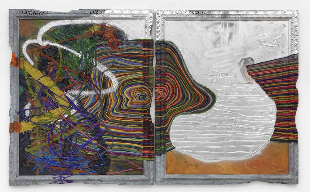 Die Bilder von Cruz sind rätselhaft, deren Komplexität von seinen Versuchen geprägt ist, das Gleichgewicht zwischen gegenständlichen und abstrakten Bildern wiederzufinden. Dies brachte ihn dazu, den Akt des Malens als Tätigkeit zu definieren, in der man es vor allem mit einem physischen Objekt zu tun bekommt – einem Ding, das physischen Deformationen unterliegt: Etwas, das geschnitten, verbrannt und gebogen werden kann. Die Oberfläche des Objekts (die Leinwand) wird damit zur Nebensache und kann angefüllt, aber auch leer gelassen werden. Die aufgetragenen Farben und Texturen werden damit vielmehr zu einer Materialisierung einer Präsenz, als zu einer Konstruktion von Bildern. Und es ist diese Präsenz, die sich in den Bildern von Cruz in die Präsenz eines konzeptuellen Schemas innerhalb seines künstlerischen Prozesses übersetzt, den er als „Darstellungen gebrochener Bilder, Formen und Texturen“ beschreibt, „die absichtlich reduziert und neu geschaffen wurden“. Wie bereits in seinen früheren Arbeiten verbergen sich die erkennbar figurativen Bilder unter den Schichten seiner Malerei. Die reliefartig dicken Linien aus bunter Ölfarbe dienen, je nach Perspektive, als Hintergrund oder entstellte Oberflächen. Die meisten seiner Arbeiten zeigen gleichsam die „Schatten“ expliziter Genre-Malereien, die sowohl Portraits als auch Landschaften oder flämische pastorale Szenen umfassen. In seinen derzeit bei ARNDT Berlin unter dem Titel Subtraction Paradise präsentierten Arbeiten verwandeln sich die zahlreichen bunten Linien in massive und singuläre Hindernisse. Laut Cruz stellen diese Werke „den Versuch dar, die Dinge einfacher zu machen und auf eine natürliche Weise besser zu definieren, vor allem in Bezug auf den Umgang mit negativen Räumen und damit den erschreckendsten Aspekt meiner Arbeit“. Seine Bilder, die er früher in einem wilden und anarchischen Farbauftrag gewaltiger Schichten von Linien und Schlieren schuf, entwickelten sich zu scharfen Konturen dicker und großflächiger Farbschichten. Sie gehen über den Rahmen hinaus und setzen sich damit über dessen strukturierende Qualität hinweg. Diese Wandlung zeigt sich besonders deutlich in seinem in dieser Ausstellung gezeigten Diptychon Untitled (2015): Dem chaotischen Liniengewirr auf der linken Leinwand steht ein großes und kompaktes silber-weißes Feld auf der rechten Leinwand gegenüber. Damit wird in diesem Werk die sein gegenwärtiges und vergangenes Kunstschaffen durchziehende Dichotomie deutlich, nämlich die durch den horror vacui der Einfachheit und Reinheit des negativen Raums ausgelöste Verzückung.