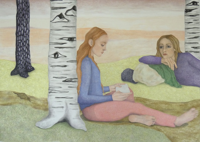 Andere Zeichnungen wie „The Garden“ und „Awaking“ zeigen Gruppen von Frauen in Außenräumen, die sich dennoch intim, taktil und geschlossen anfühlen. Das liegt vor allem an der Farbpalette und den weichen Texturen der Pastell- und Aquarellfarben, die van Klaveren verwendet, aber es gibt auch eine sanfte Synergie zwischen den Figuren und der Umgebung. In „The Garden“ zum Beispiel liegt eine gelb gekleidete Frau entlang der Horizontlinie, wobei sich die Kurven ihres Körpers kaum von der Oberfläche abheben, auf der sie liegt, während vor ihr eine andere Figur barfuß sitzt und mit dem Stiel einer Blume spielt. In ähnlicher Weise scheinen die Figuren in „Awaking“ nicht nur in völliger Ruhe in der Landschaft zu sein, sondern ein Teil von ihr, wie Flüsse und Hügel oder alte Felsformationen.
