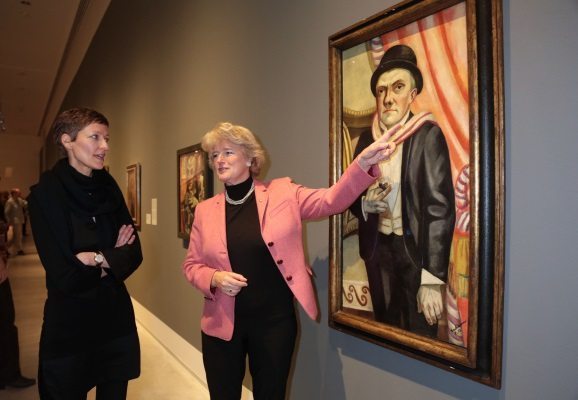 Bildunterschrift: 31. Januar 2016, Prof. Monika Grütters, MdB, Staatsministerin für Kultur und Medien, mit Dr. Stefanie Heckmann, Leiterin der Sammlung Bildende Kunst und Kuratorin der Ausstellung „Max Beckmann und Berlin“, vor dem „Selbstbildnis vor rotem Vorhang, 1923 (Leihgabe aus Privatbesitz, © VG BILD-KUNST Bonn, 2016), Berlinische Galerie 2016, Foto: Amin Akthtar.