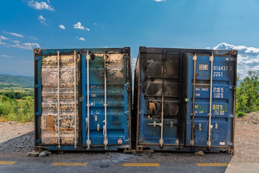 Abb. oben: Petrit Halilaj, Charred and Graffitied steel shipping containers housing ‘Syrigana’ props, Syrigana, 2025. Photo: Esad Duraki, Courtesy ChertLüdde, Berlin and Petrit Halilaj.