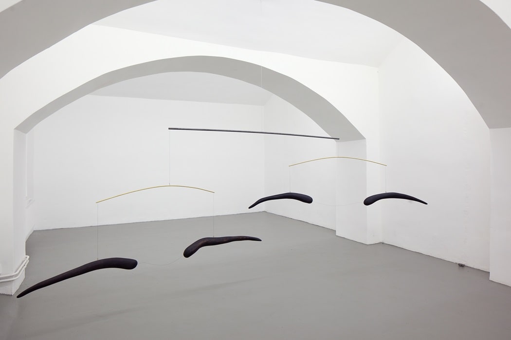 Abb. oben: Kasia Fudakowski, Raised in Surprise, Lowered in Disbelief, 2016, Installation Stained pine wood, steel, brass, nylon, motor, 140 x 530 x 10cm, Installed at Centre for Contemporary Art FUTURA, Prague, Courtesy: the artist, Centre for Contemporary Art FUTURA, Prague, and ChertLüdde, Berlin