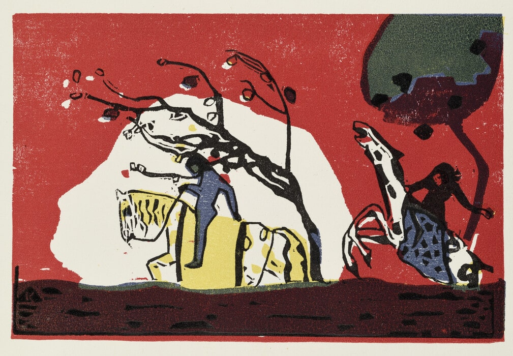 Abb. oben: Wassily Kandinsky, Zwei Reiter vor Rot, 1911 Farbholzschnitt, 10,5 x 15,7 cm (Druck) © Staatliche Museen zu Berlin, Kupferstichkabinett / Dietmar Katz.