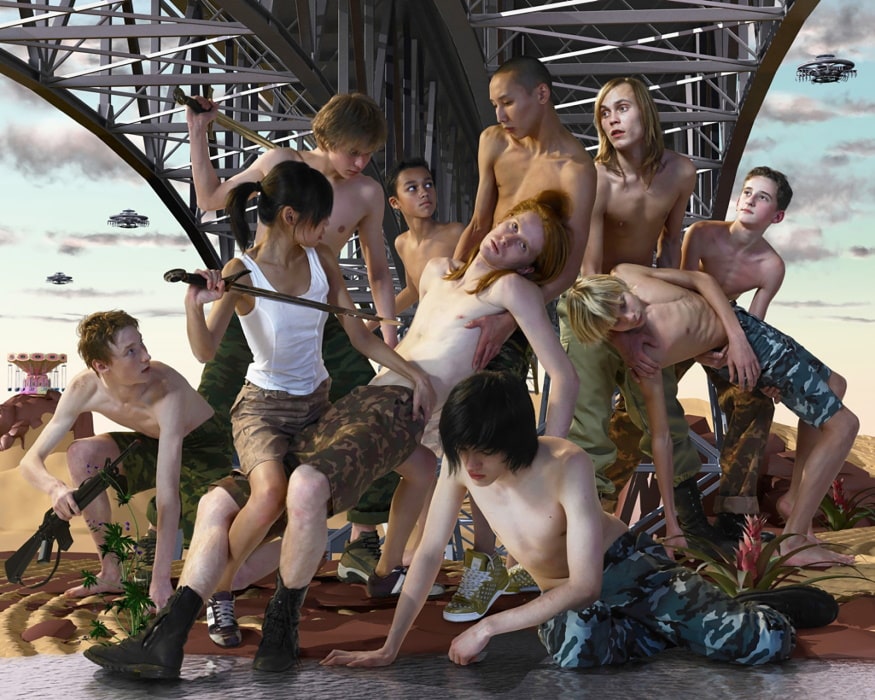 Bildunterschrift: AES+F, Last Riot 2, The Bridge, 2006, digital collage, edition pigment print on canvas, c-print, 80 x 99 cm @ AES+F.