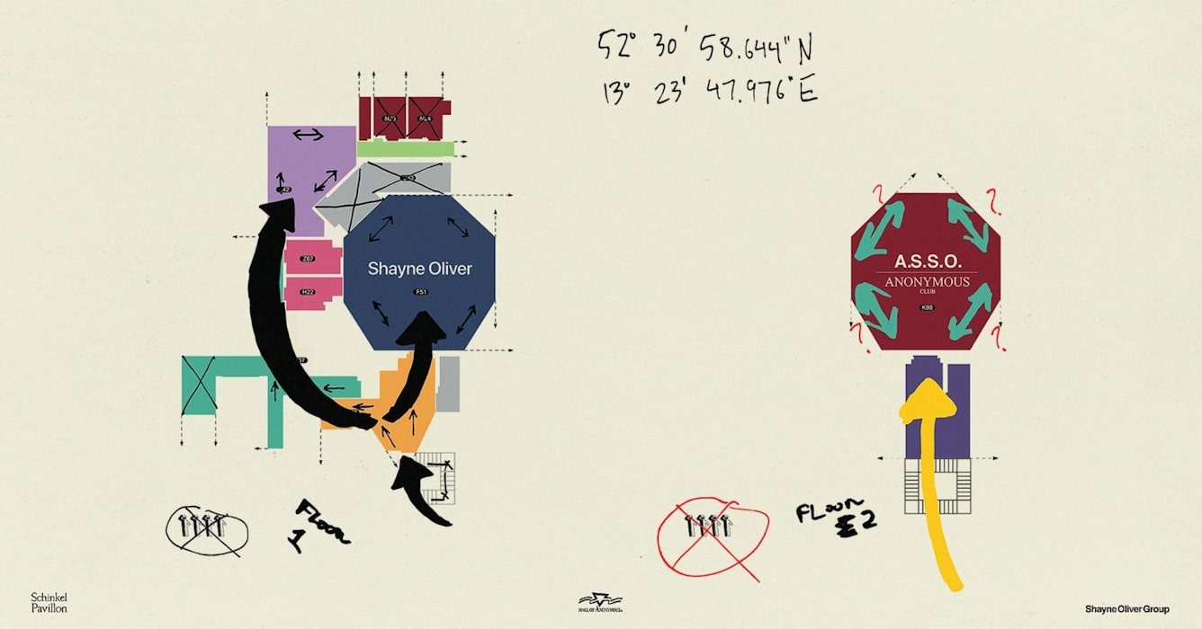 Indem er die Gepflogenheiten der Welt der Mode und der zeitgenössischen Kunst – den kanonischen Laufsteg, den Einzelhandel und den White Cube – verdrängt, greift Shayne Oliver diese Relikte auf, um einen neuen Raum zu schaffen. Wenn der Schinkel Pavillon zu einem Einkaufszentrum wird, wird die Obsoleszenz eingeführt. Doch genau das Gegenteil ist der Fall. In der Museums- und Einzelhandelsapokalypse schafft die Mall of Anonymous ihre eigene …
