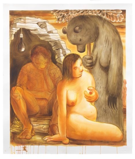 In ihrer dritten Einzelausstellung in der Galerie sind jüngst entstandene, meist großformatige Malereien auf Papier zu sehen, die teils sehr intime Einblicke und Beobachtungen der Künstlerin zeigen. Immer wieder entführen sie auch in traumhafte Szenerien, deren Bedeutung und malerischer Reichtum sich erst allmählich erschließt. So blickt in Untitled (for now) (2015), eine nackte Sitzende auf ins Firmament, an welchem kaum sichtbar das Sternbild „Wut“ prangt, während in Three Women (2015) ein Bär mit traurig gesenktem Kopf in eine melancholische Idylle integriert wird.