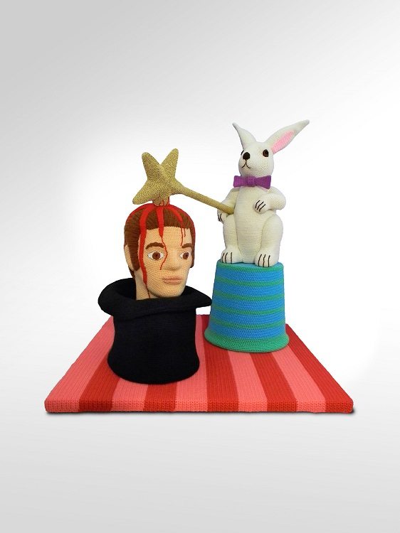 Bildunterschrift: ©Patricia Waller Hocus-pocus, 2014, Wolle-, Styropor, Kunststoff, Holz, Häkelarbeit, 70 x 70 x 75 cm