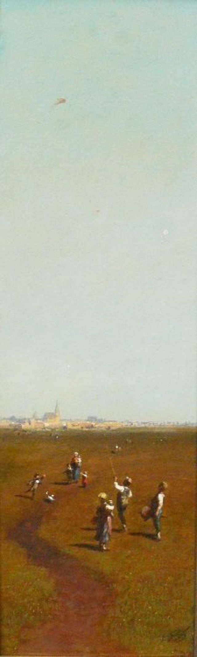 Durch die Wiese mäandert ein Fußweg, auf dem in Richtung des Betrachters eine Frau mit einem Kind auf dem Arm spaziert, begleitet von zwei Knaben und einem kleinen Mädchen. Ein Knabe läuft vorweg, ihm zu Füßen springt ein weißes Hündchen. Der Knabe reißt im Lauf einen Arm in die Höhe, begeistert in Richtung Himmel weisend. Folgt man seinem Weisen, bleibt der Blick an einer hauchzarten Drachenschnur hängen, die den Himmel fast unsichtbar teilt, und an deren Ende ein Drachen schwebt. Welchen der drei im Bild sichtbaren Drachen die Schnur mit seinem Besitzer verbindet, ist nicht eindeutig erkennbar. Sehen wir im Bildvordergrund doch nur einen Jungen, der diese eine Schnur erfahren mit einem Arm steuert. Ihm zur Seite ein weiterer Junge und ein Mädchen mit einer Puppe oder einem Baby auf dem Arm, das friedvolle Spektakel betrachtend. Die Wiese selbst zeigt kein sattes Grün, sondern einen milden Braunton, wie im Frühjahr nach der Schneeschmelze oder im Herbst nach der Heumahd. Der wolkenlose Himmel scheint jedoch frühlingshaft frisch und lässt den Betrachter fragend zurück, wo denn der Wind herkommen mag, den die Drachen für ihren Flug benötigen.