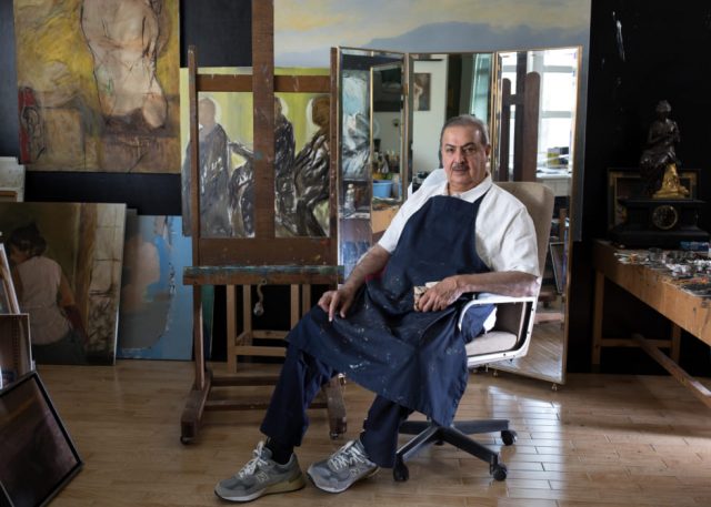 PROLOG | PERSÖNLICHES (Interview in englischer Sprache) Rashid Al Khalifa, imagine you would welcome us in your studio or home. Where do we talk together, where do we meet you? If you came to visit me, we would meet in my studio. Mainly what I do in my studio is my oil paintings — I still do and I still love them, I cannot leave it. I used to work with acrylics some time ago, and I do pastels and drawings. I like Watercolour, but you know, the oil is taking over. The metal work, like the aluminium work, has to be done outside the studio. I have helpers to do the welding for me, because aluminium needs welding and I cannot do that. The enamel spray paints are also done in a special place, because it needs to be confined and controlled, and we need to wear masks because the smell is quite strong. And in the studio I also have a small place for some books and some paintings that I did 10 or 20 years ago. Perhaps we are sitting in your favourite place? My… emm, sofa! — Hahaha, my sofa, because I sit there to look at my artworks and I just say: oh, I’ll change this!, alright, I’ll add something to some paintings. Once a painting is signed, I discipline myself not to go back to it. But before signing, I often …
