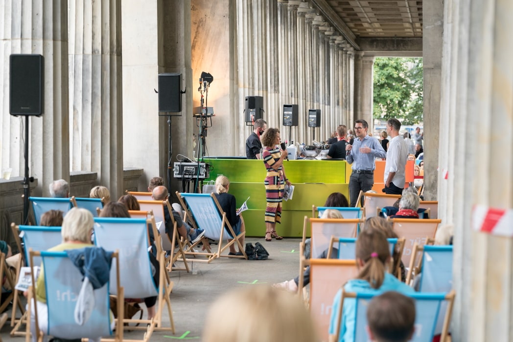 Unter freiem Himmel und mit viel Platz, in kleinen Gruppen und im Familienverbund, kann sich mit Themen der Sammlungen auseinandergesetzt werden. Zudem gibt es Angebote am Kulturforum, im Hamburger Bahnhof, im Museum für Fotografie, im Museum Europäischer Kulturen sowie im Haus Bastian. Die Kolonnaden Bar lädt ab 8. Juli wieder zu abendlichen Talks in Berlin schönste Open-Air-Location ein.
