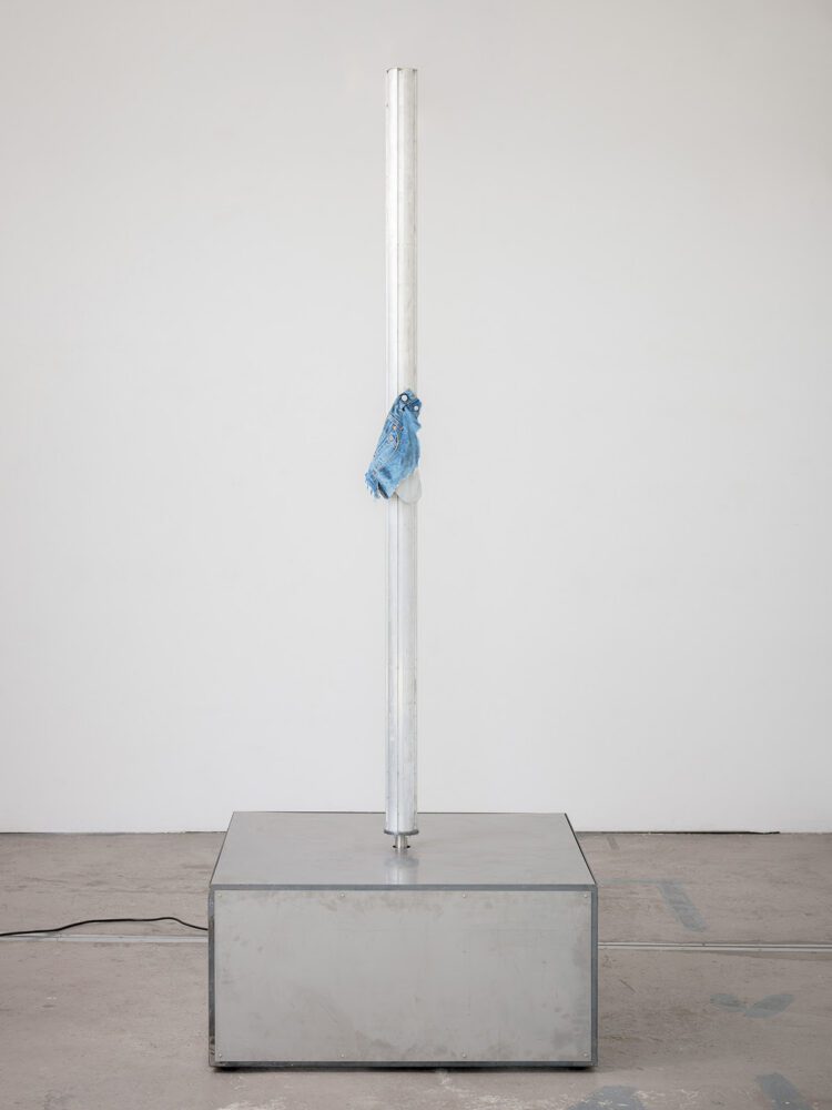 -United Fuckers of Contingency in Stasis, 2026, Aluminiumstange, Jeans, Münzen, Motor, Edelstahl