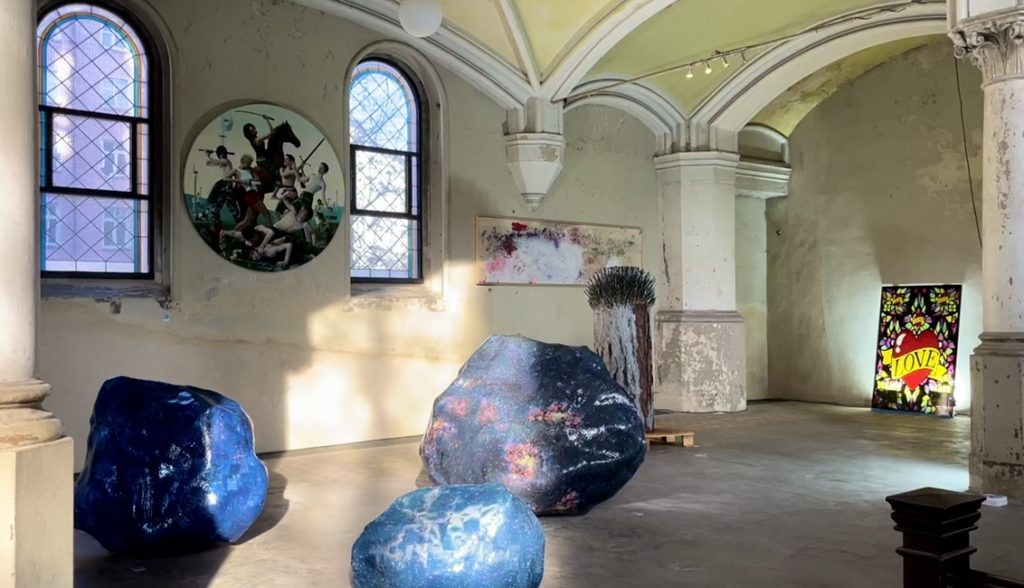 Das Kirchengebäude der Zionskirche liegt wie ein aufragendes Schiff mitten in Prenzlauer Berg. In der Ausstellung „Points of Resistance“ finden dort 55 Künstler einen temporären Ort, um trotz Pandemie neue Werke zu präsentieren. Die Zionskirche wird zu einer Art Arche für die Kunst, diese kommt im Kirchenschiff gewissermaßen zu ihren Ursprüngen zurück, ist sie doch einst aus religiösen Kulthandlungen hervorgegangen. Man mag andererseits im Kontext der Philosophie an Hegels „Phänomenologie des Geistes“ denken, wo es heißt, daß der “wirkliche Geist“ erst in der Phase der „Kunstreligion“ das Bewusstsein vom „absoluten Wesen“ erlangt habe und damit zu sich gefunden habe. Ob im Kult oder in der Philosophie: Kunst und Kirche waren in der Geschichte immer wieder …