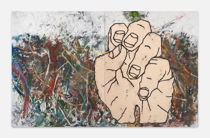 Für RUN (Fraktale) hat Arnolds drei monumentale, mehrfarbige Ölgemälde und drei kleinere, fast monochromatische Werke in Grau-, Schwarz- und Olivgrüntönen geschaffen. Das figurative Bildvokabular, das er in den letzten Jahren entwickelt hat und das zuvor mit großen monochromen Flächen kontrastiert wurde, ist in diesen neuesten Arbeiten entweder mit abstrakten, vielfarbigen, dicht geschichteten Hintergründen verwoben oder ganz aus dem Bild herausgedrängt.“