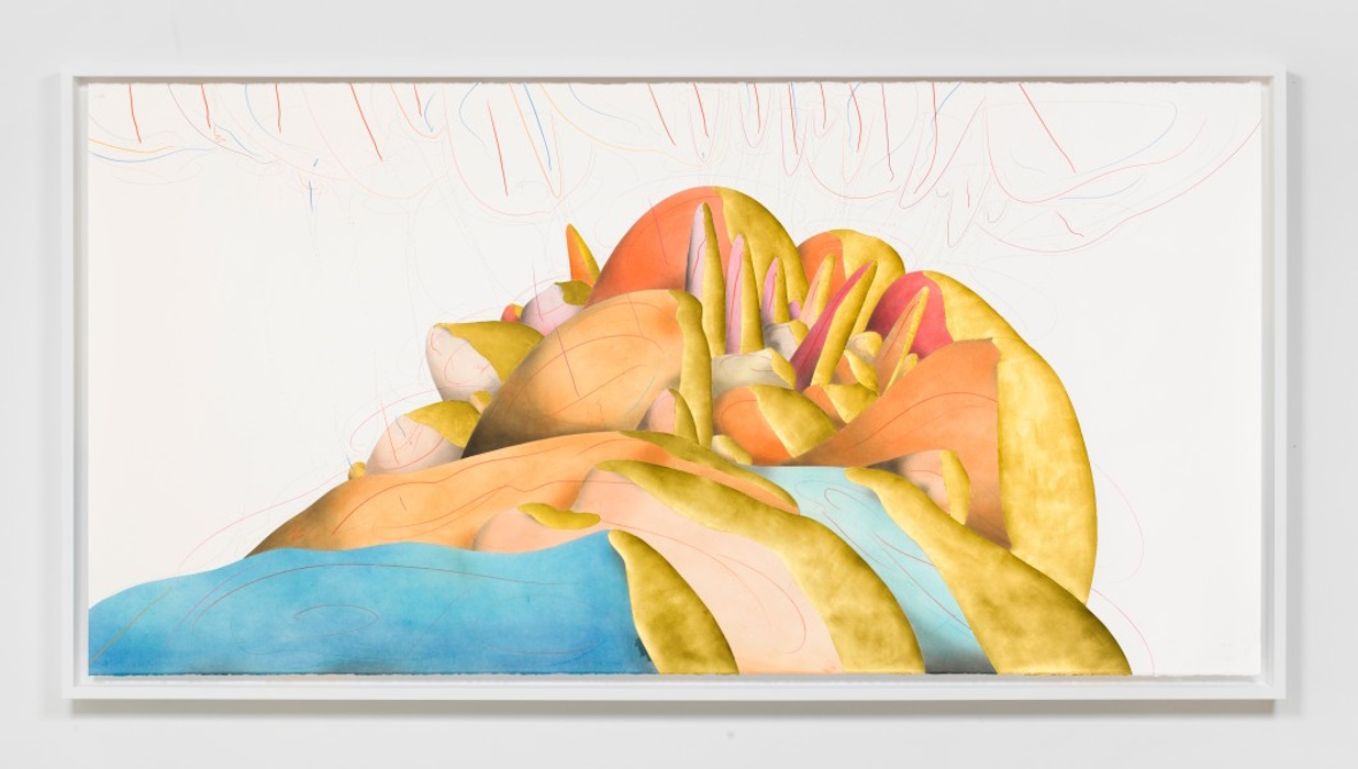 Abb. oben: Jorinde Voigt, 33 Hills, 2017, Tusche, Blattgold, Pastell, Ölkreide, Bleistift auf Papier, gerahmt, 140 x 280