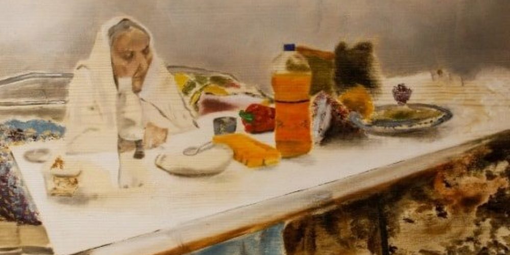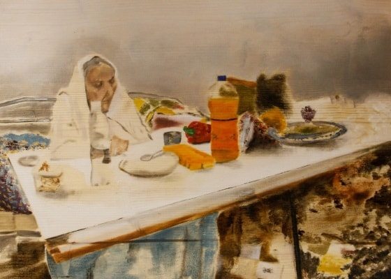 Bildunterschrift: Yonatan Ron, Table Composition (Great Grandmother), Oil on Wood, 31 x 43 cm, 2016
