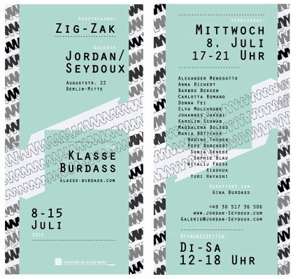 bis 15.07. | #0126ARTatBerlin | Die Galerie Jordan/Seydoux freut sich sehr, vom 8. bis zum 15. Juli 2015 mit der Gruppenausstellung „Zig-Zak“ die Werke von 17 jungen Nachwuchstalenten der Klasse Gina Burdass präsentieren zu dürfen. Gina Burdass ist eine Malerin aus London. Sie ist seit 2012 Professorin für Malerei und Zeichnung an der UdK.